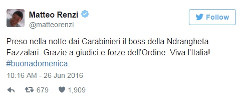 Італійський уряд привітав новину про його арешт. Прем'єр-міністр Маттео Ренці написав у "Твіттері": "Спасибі суддям і силам правопорядку. Хай живе Італія!"