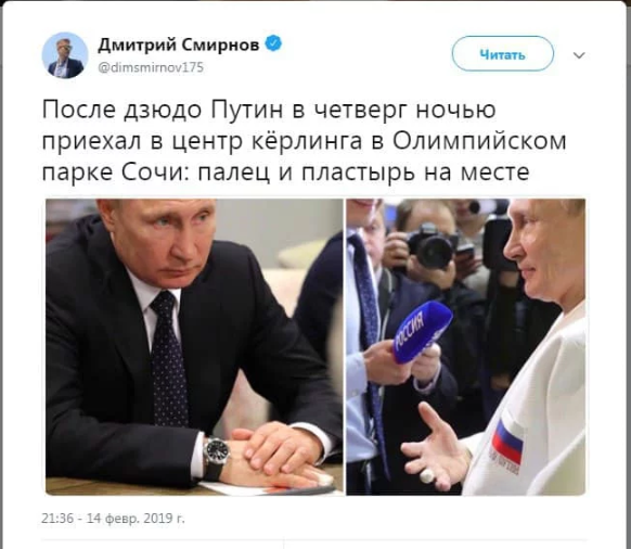 “Сумний в Путіна трапився День всіх закоханих. Зате з виразу обличчя одразу видно: котрому Путіну пальця ломали, котрому – для конспірації просто перемотували”, – написав Голобуцький і додав скрін допису журналіста кремлівського пулу Дмитра Смирнова зі світлинами “Путіних”.
