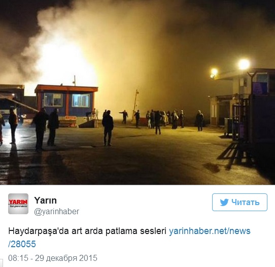 Вибух стався на стоянці стамбульського порту Хайдарпаша. В результаті зайнялася фура, постраждав водій. За словами лікарів, зараз його стан задовільний. Пожежа, за попередніми даними, міг початися з-за вибуху паливного бака. Видання зазначає, що у вантажівки були українські номери. Автомобіль перевозив фрукти.