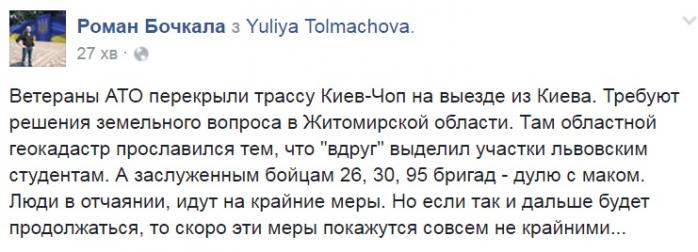 "Потребують вирішення земельного питання в Житомирській області. Там обласний геокадастр прославився тим, що "раптом" виділив ділянки львівським студентам. А заслуженим бійцям 26, 30, 95 бригад - дулю з маком. Люди в розпачі, йдуть на крайні заходи",-написав журналіст.
