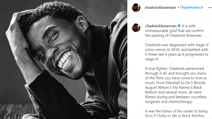 "Будучи справжнім бійцем, Чедвік витримав все це і подарував фільми, що так полюбилися . "Маршалл", "П'ятеро однієї крові", "Black Bottom Ма Рейні" і ще кілька картин - всі вони були зняті в проміжках між незліченними операціями і хіміотерапією. І це була честь для нього - дати життя королю Т'Чаллі у фільмі "Чорна пантера", - зазначено в повідомленні.