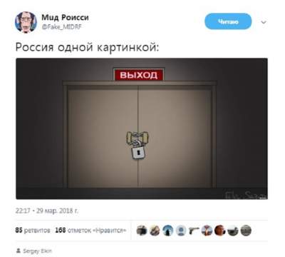 Відомий кариткатурист з РФ Сергій Йолкін висміяв всю суть Росії в одному малюнку. Забавна карикатура, опублікована на сторінці "МЗС Роисси" Twitter.