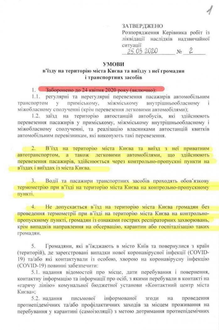 Нардеп також опублікував документ, затверджений розпорядженням керівника робіт з ліквідації наслідків надзвичайної ситуації. У документі наголошується, що водії і пасажири транспортних засобів повинні будуть пройти обов'язкову термометрію на в'їзді до Києва.
