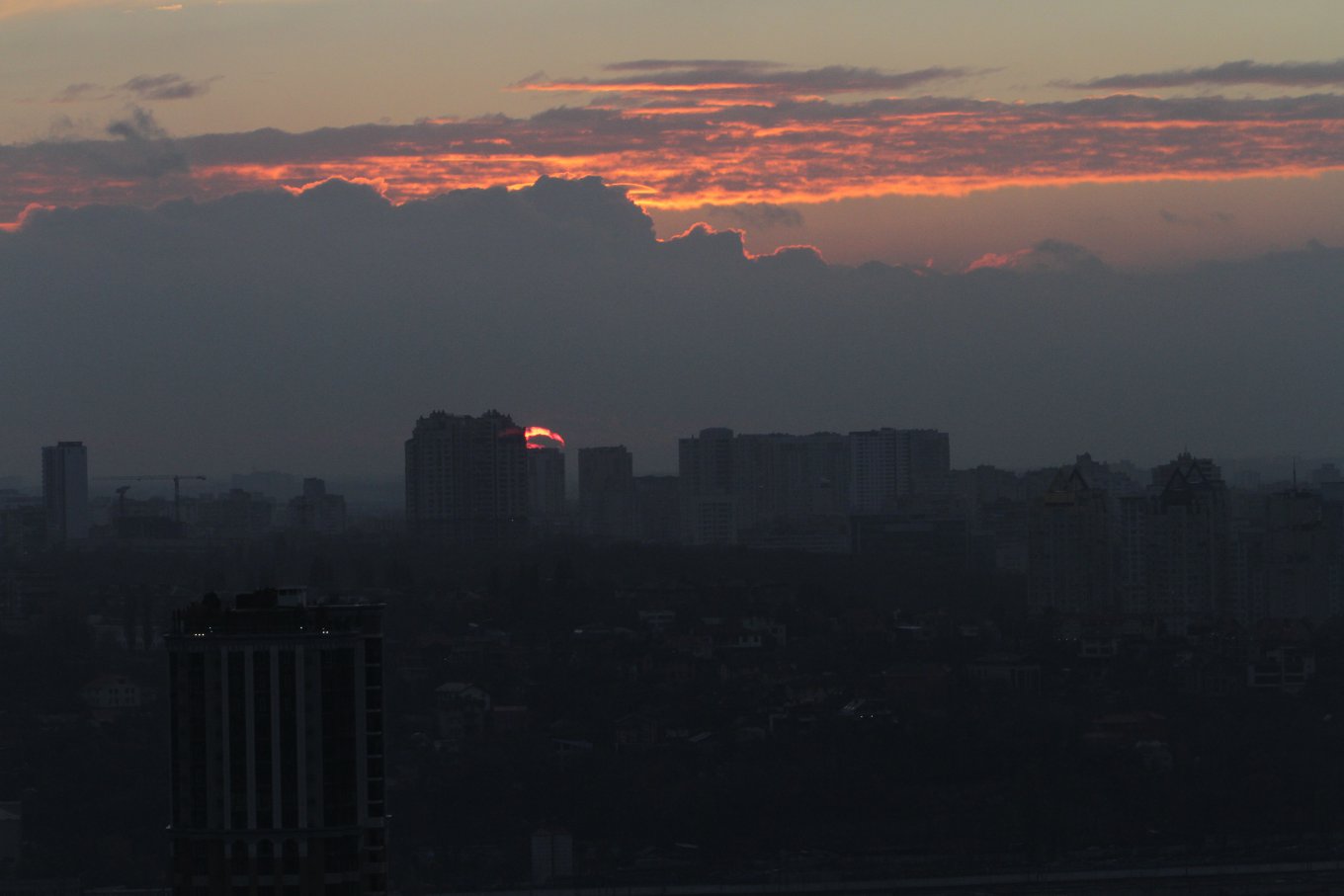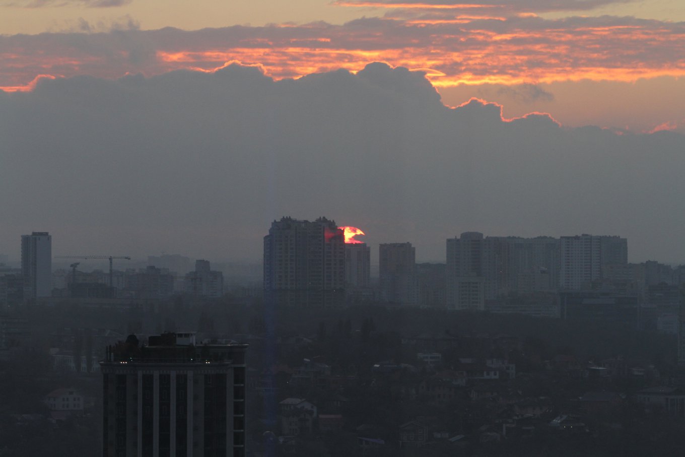 У понеділок, 7 листопада, жителі столиці мали змогу помилуватися незвичайним заходом - ввечері небо стало червоним і на ньому з'явилася яскрава сонячна пляма, що нагадує літаючу тарілку.