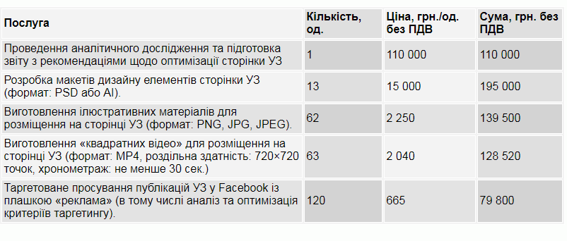 Строком до кінця року замовили підтримку офіційної сторінки «Укрзалізниці» у соцмережі «Фейсбук» за 653 тис грн. Ціни окремих послуг наведено у таблиці нижче.